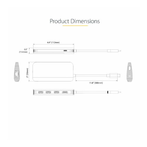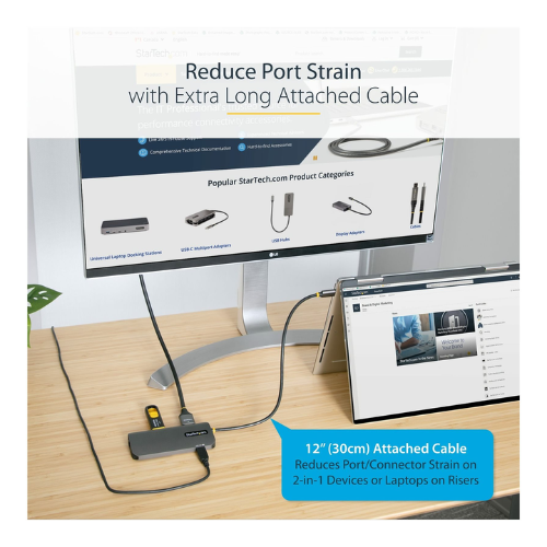 The StarTech 0.3M USB-C Multiport Adapter is a compact docking solution designed for USB-C laptops. It provides 4K HDMI video output, three USB-A 3.2 ports, Gigabit Ethernet, and SD/MicroSD support while delivering up to 100W Power Delivery to charge your laptop. The integrated 12in / 30cm cable makes it ideal for mobile use or desktop setups, giving you reliable connectivity and charging in one compact device.