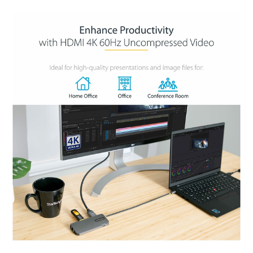 The StarTech USB-C Multiport Adapter with HDMI, RJ45, and 100W Power Delivery combines essential connectivity, compact design, and charging capability for travel or desktop use.